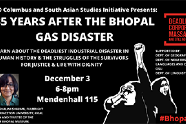South Asian Studies Initiative (SASI) at Ohio State and Association for India's Development (AID Columbus), an OSU student organization, are pleased to present a lecture and discussion: "35 Years After the Bhopal Gas Disaster," with Shalini Sharma, a Trustee of the Remember Bhopal Museum, an Oral Historian, and a Fulbright Fellow at Princeton University.