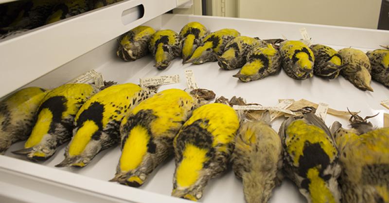 Undergraduate Research Assistant Grant Terrell emerges from the collection’s aisles like a specimen sprung back to life — his dark hair powdered gray and accented with a shock of white like a classic French homage to a white-winged chough. Grant is a history major with a minor in ecology and evolution. In his capacity as an undergraduate research assistant, he manages visits to the Tetrapods Collection, sets up displays, enters data, prepares museum study skins and teaches and trains volunteers.