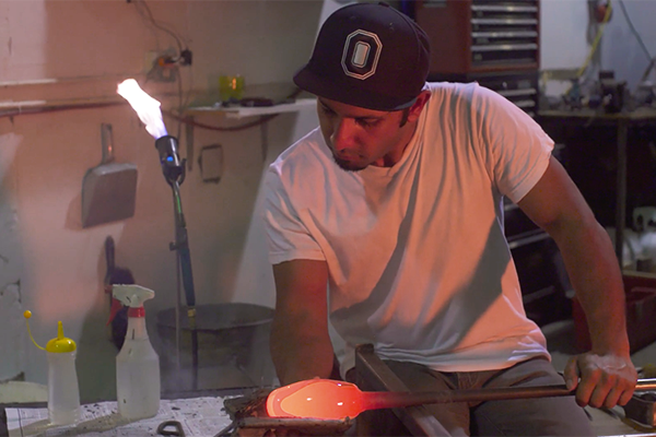 In the studio, Khan was using his hands, manipulating materials and bonding with a friend and a mentor over something new. Eventually, he reached a crossroads. He wanted to pursue glassmaking, so he dropped his business degree aspirations in favor of a BFA in glass.